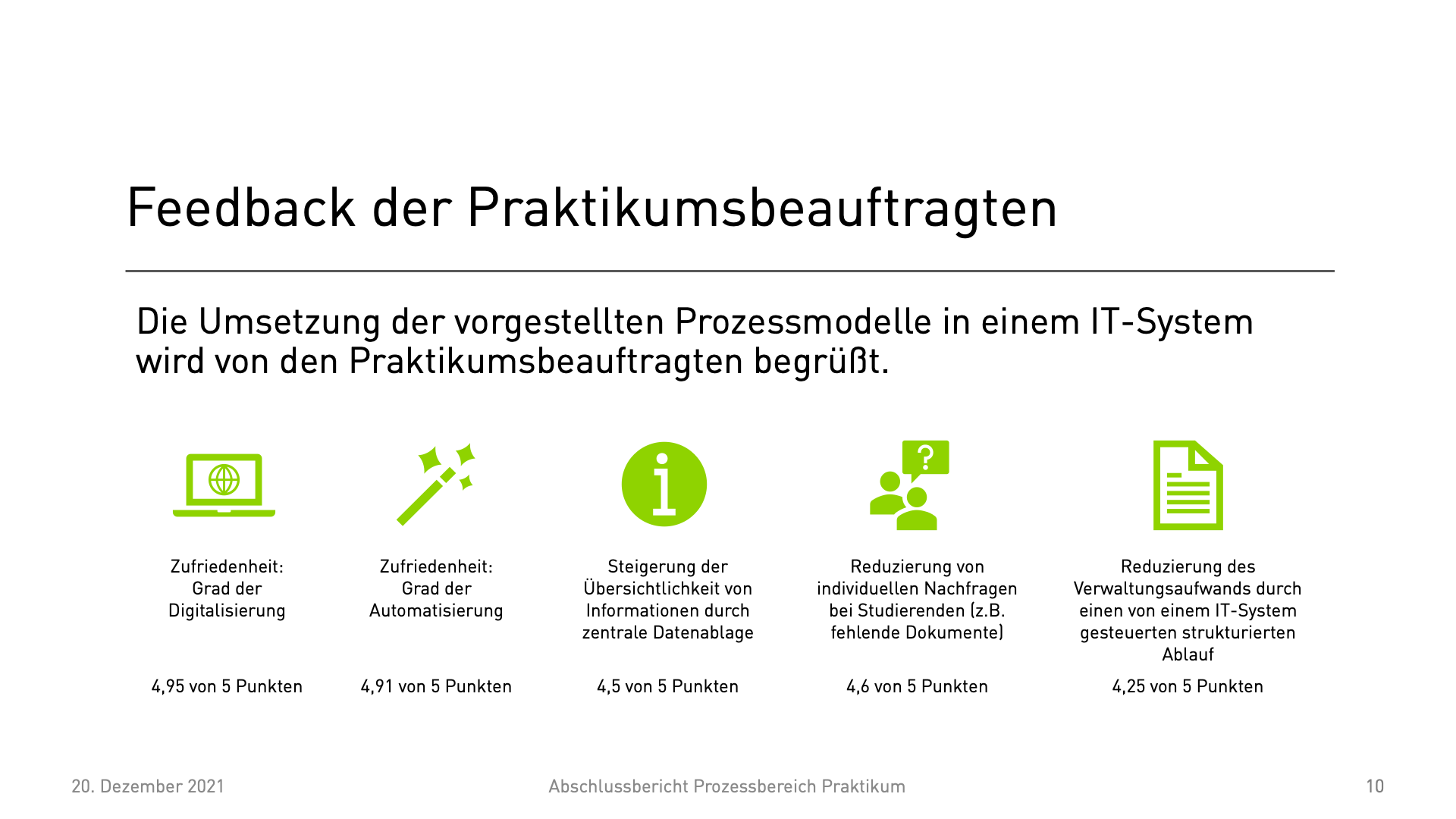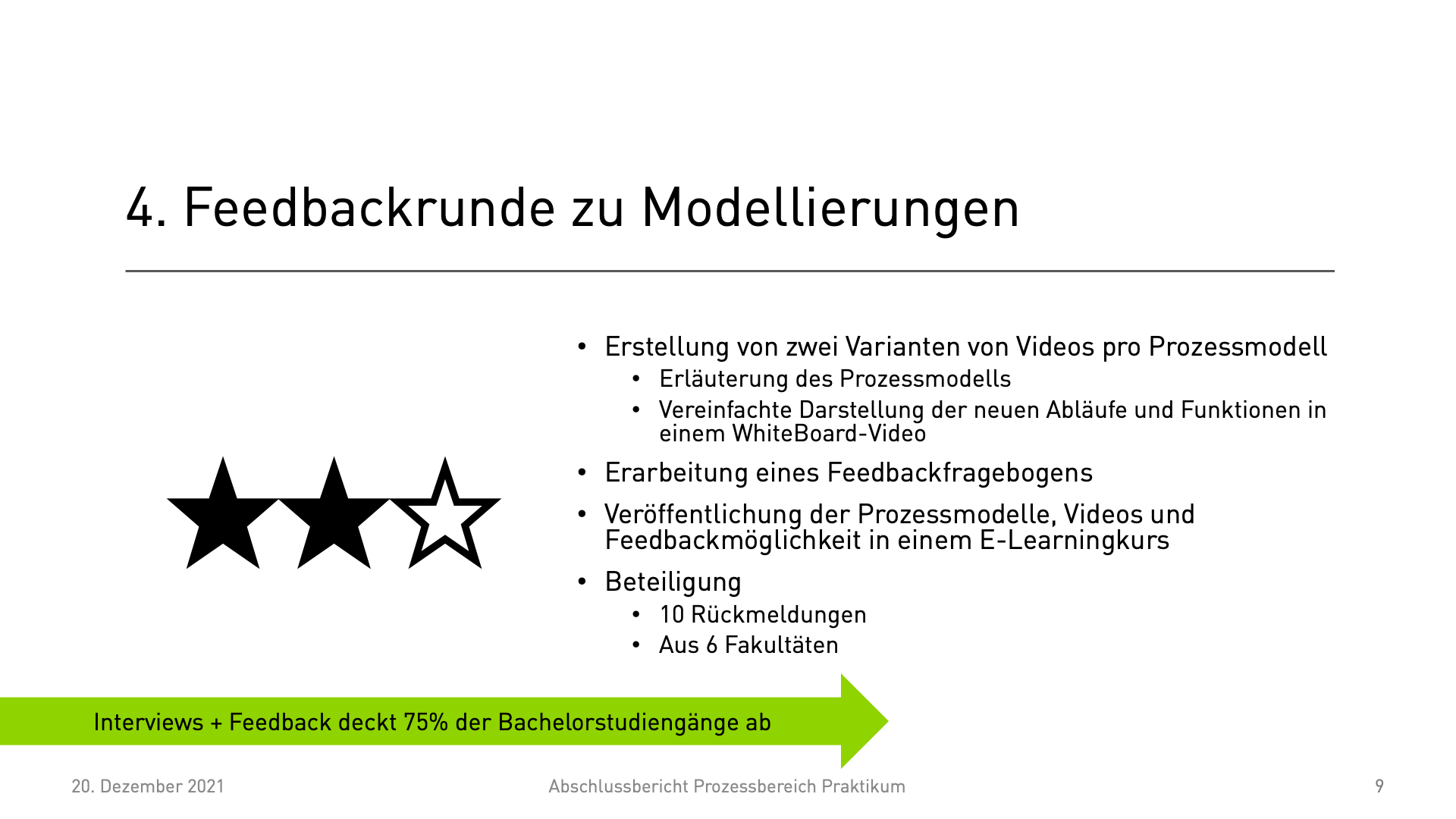 Um Feedback von den Praktikumsbeauftragten zu den Prozessmodellen einzuholen, wurden für jedes Teilprozessmodell zwei Videos erstellt und Fragebögen entwickelt. Durch Whiteboard-Videos sollen die neuen Abläufe und Funktionen auf einfache und anschauliche Weise den Betroffenen nähergebracht werden. In weiteren Videos wurden die Prozessmodelle dargestellt und die einzelnen Aktivitäten und Abläufe erklärt. Über bereitgestellte Fragebögen konnten die Praktikumsbeauftragten zu jedem Prozessmodell Stellung nehmen und Feedback abgeben. Die eingereichten Rückmeldungen wurden im Nachgang ausgewertet und im Bedarfsfall Anpassungen an den Prozessmodellen vorgenommen.