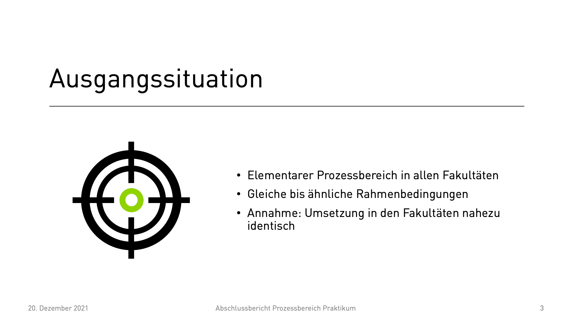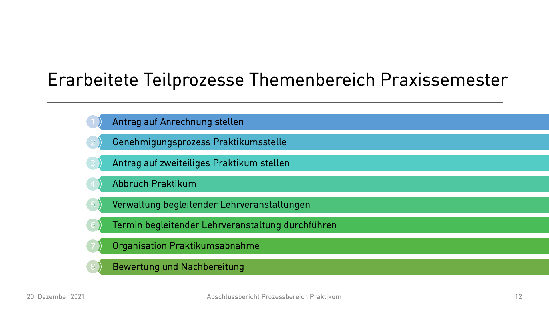 Gemeinsam mit dem Steuerkreis des Projektes wurden zunächst vier Prozessbereiche ausgewählt, die für eine initiale Bearbeitung in Frage kommen. Aus dieser Auswahl wurde schließlich der Prozessbereich zur Verwaltung und Organisation der Praxissemester zur Bearbeitung bestimmt.