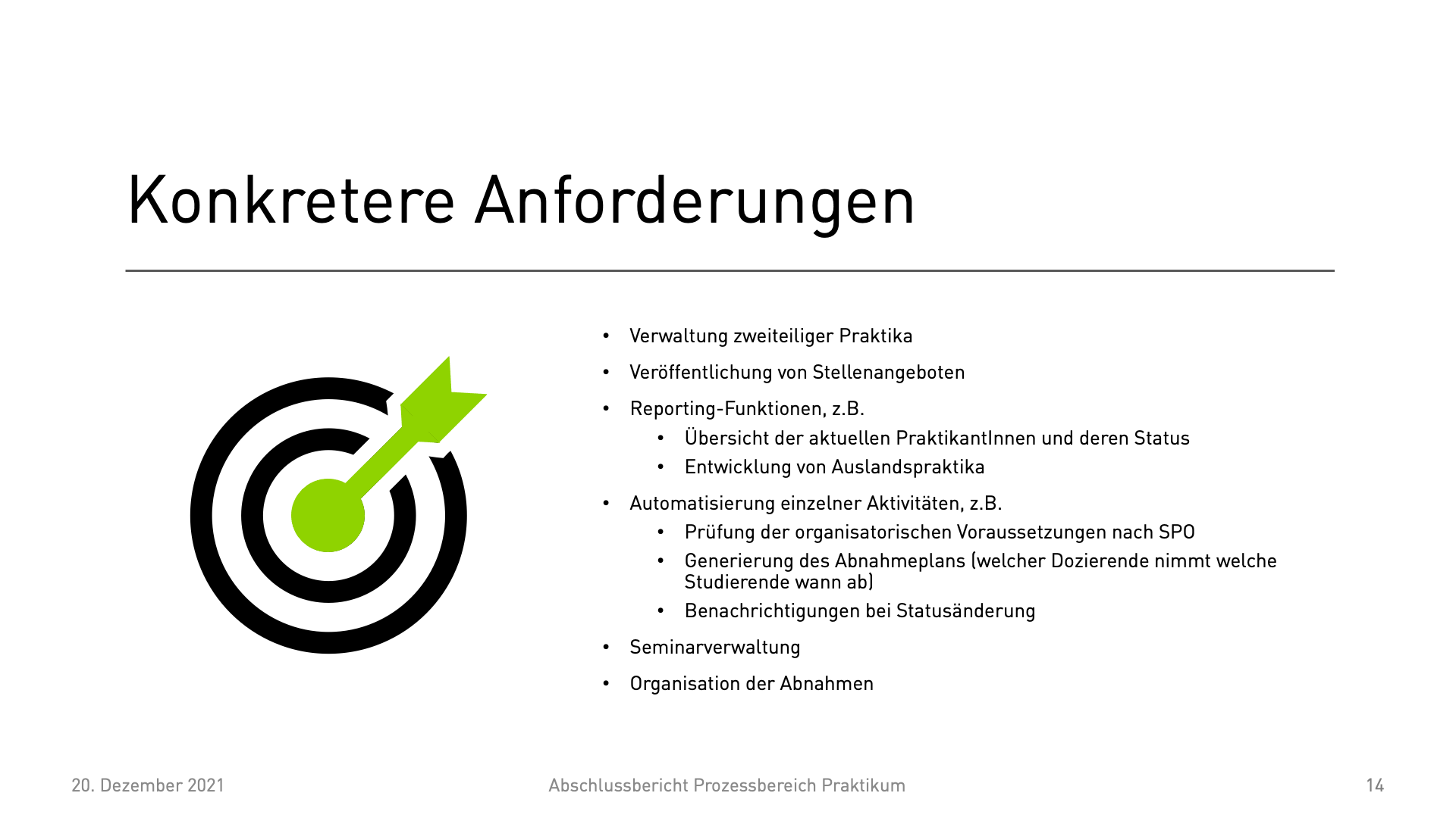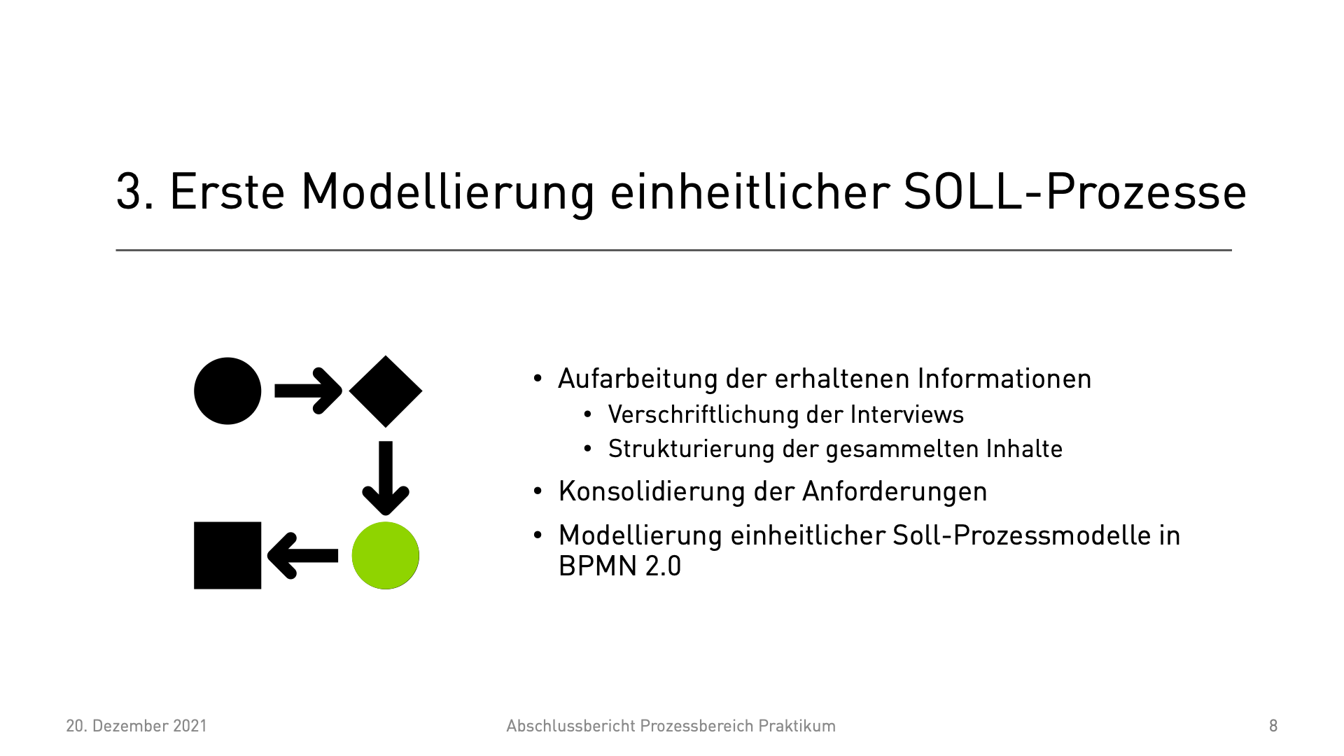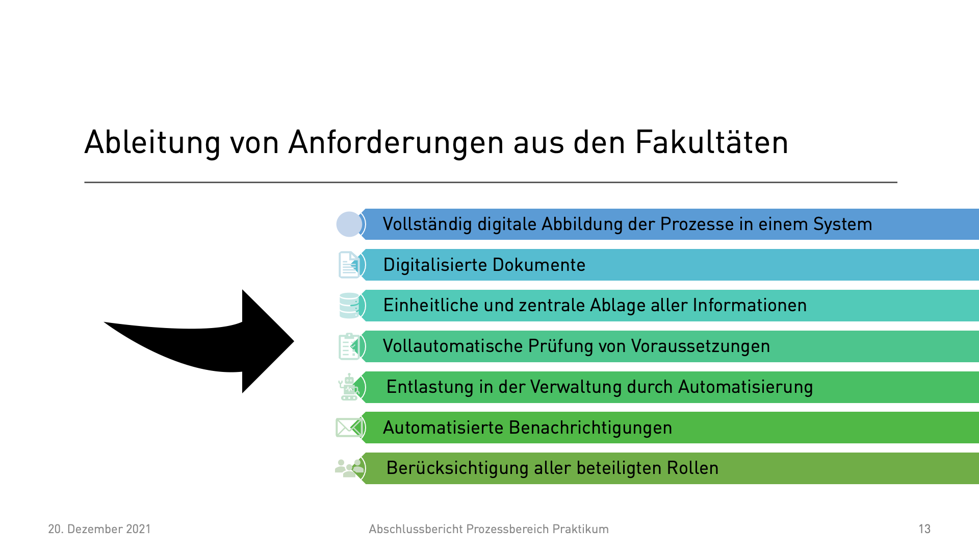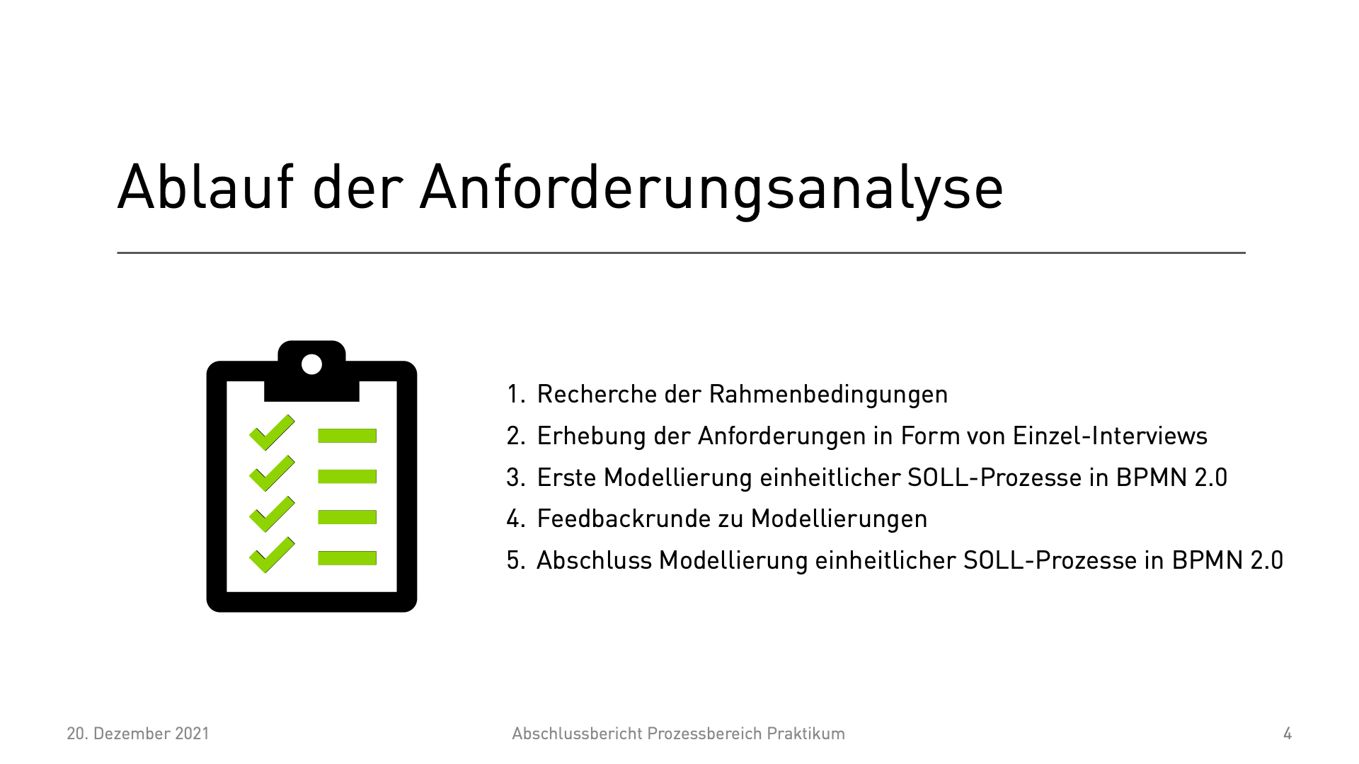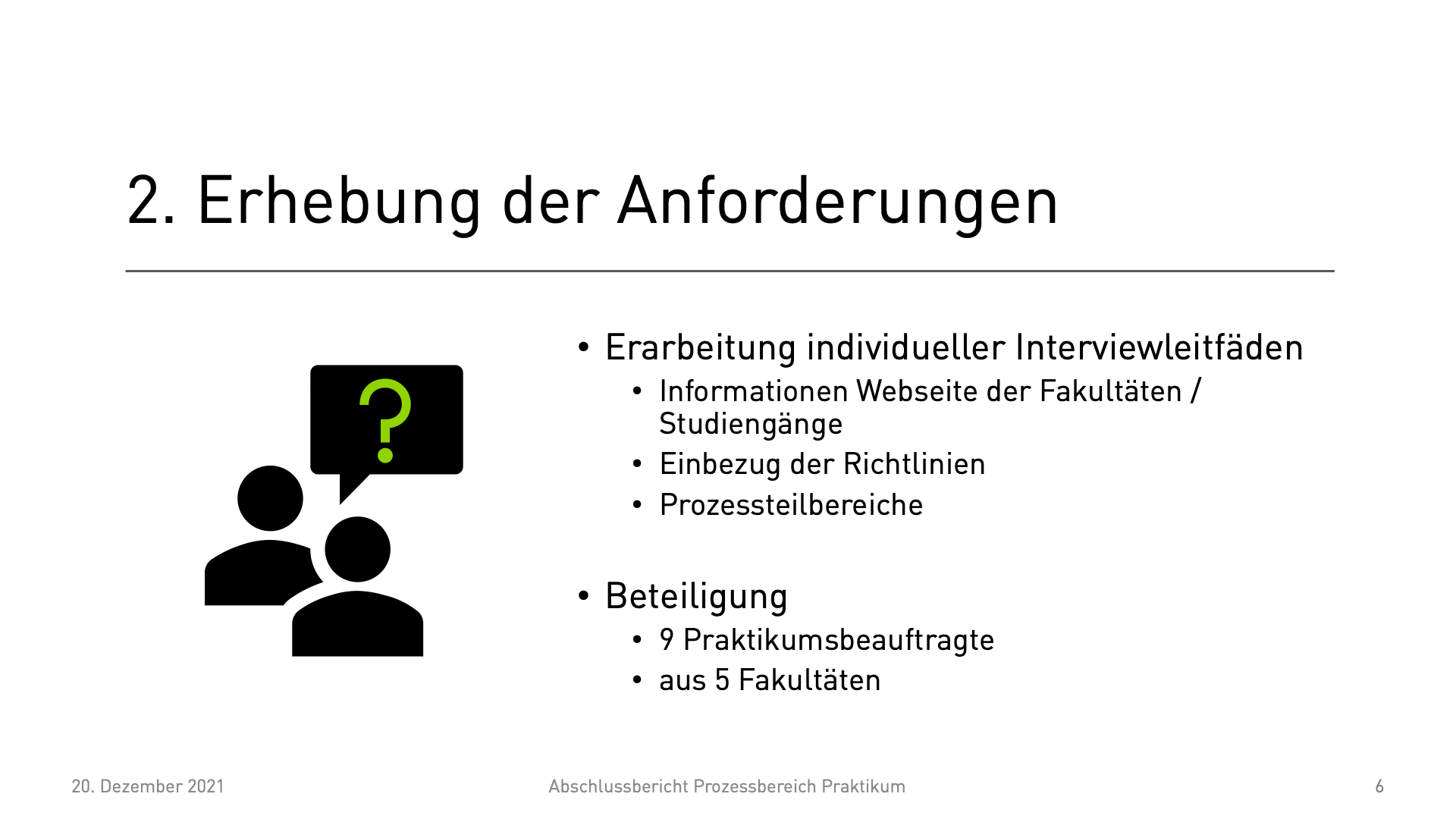 Innerhalb der Bearbeitung dieses Prozessbereiches wurden alle Fakultäten eingeladen, bei der Bearbeitung mitzuwirken. Für die Durchführung der Anforderungsanalyse wurden zunächst die Rahmenbedingungen in Form von gesetzlichen Vorgaben und Richtlinien recherchiert und individuelle Einzelinterviews mit den Praktikumsbeauftragten der Studiengänge organisiert und durchgeführt. Die aktuellen Abläufe sowie Anforderungen und Probleme wurden erfasst. Anhand dieser Erkenntnisse wurden erste Soll-Prozessmodelle erstellt, die einheitlich für alle Fakultäten umgesetzt werden können. Bei der Neu-Modellierung der Prozesse wurde neben der Vereinheitlichung und Optimierung darauf geachtet, dass die Abläufe möglichst voll-digitalisiert abgebildet werden. Auch die (Teil-)Automatisierung von Aktivitäten zur Entlastung der Praktikumsbeauftragen bei Verwaltungsaufgaben wurde berücksichtigt.