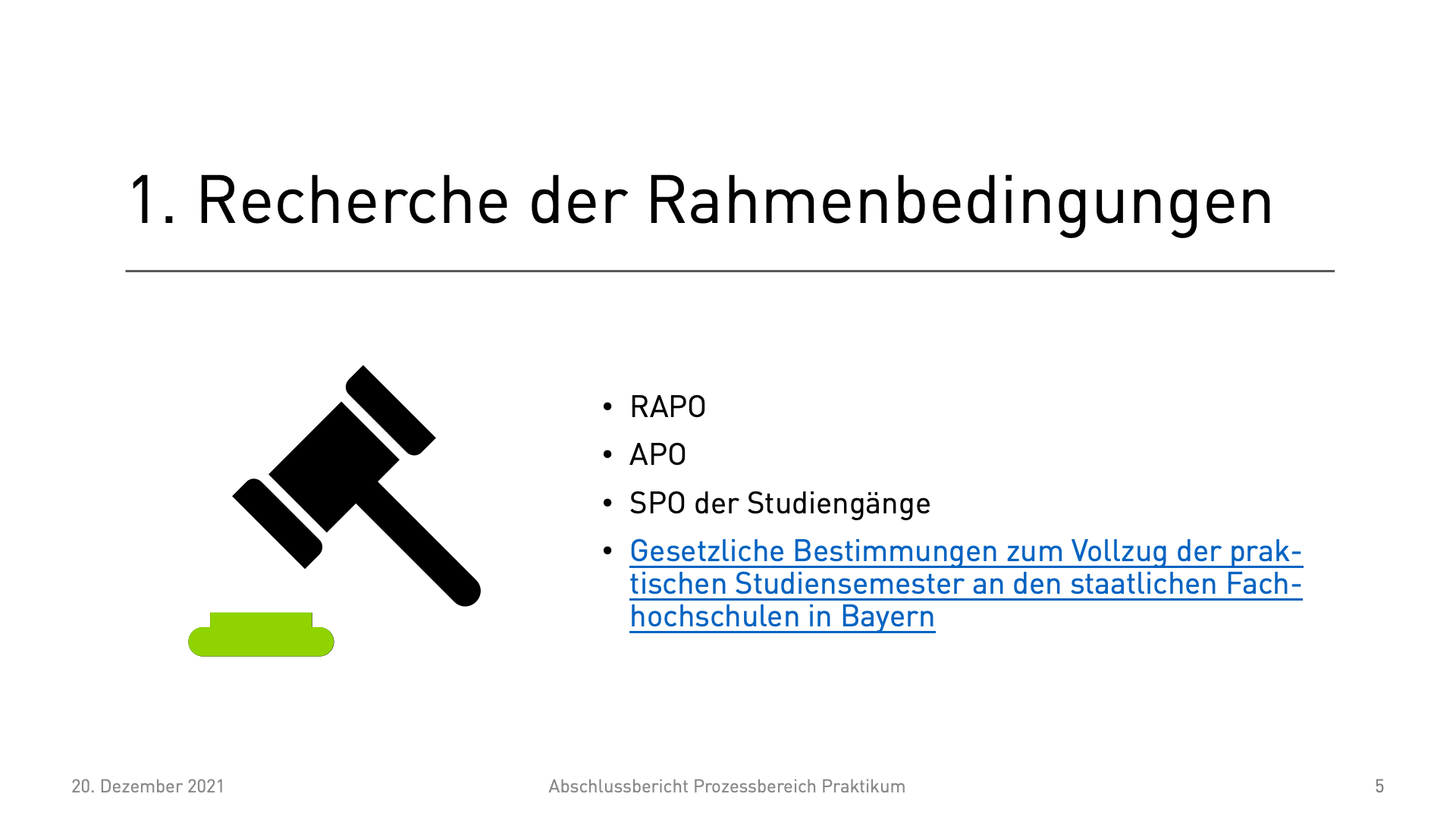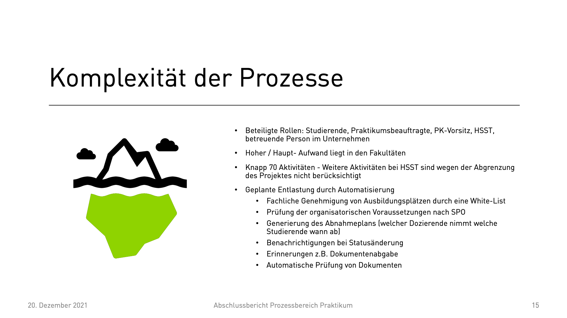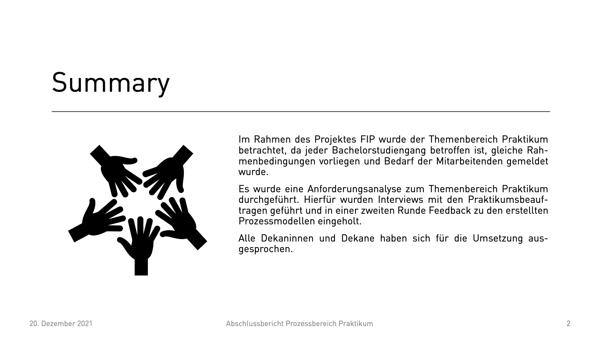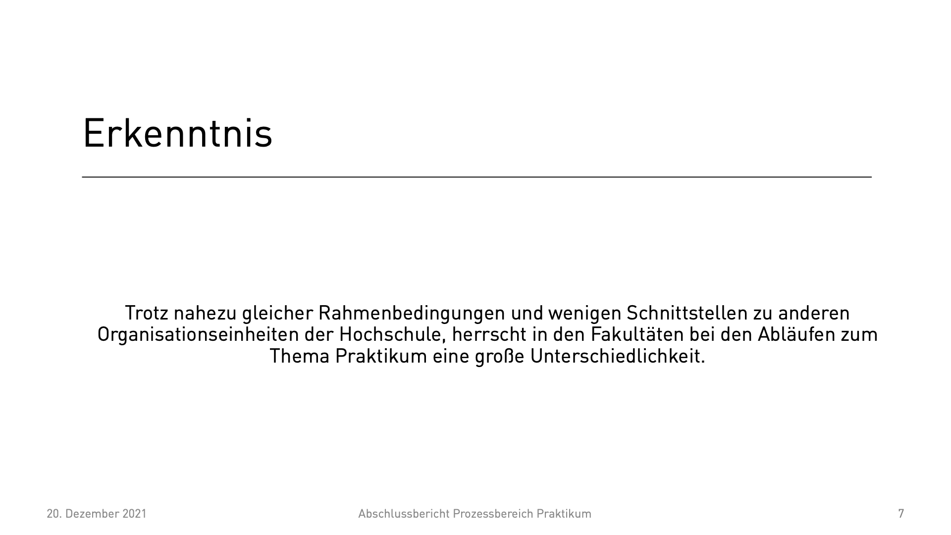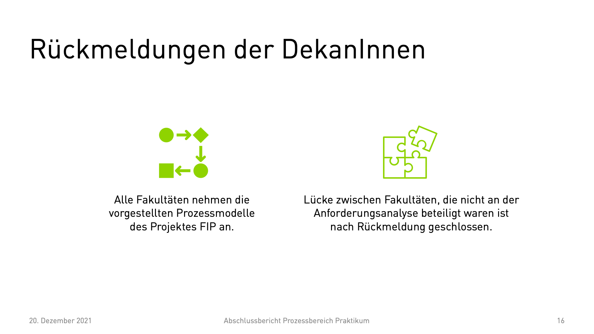 Innerhalb der Bearbeitung dieses Prozessbereiches wurden alle Fakultäten eingeladen, bei der Bearbeitung mitzuwirken. Für die Durchführung der Anforderungsanalyse wurden zunächst die Rahmenbedingungen in Form von gesetzlichen Vorgaben und Richtlinien recherchiert und individuelle Einzelinterviews mit den Praktikumsbeauftragten der Studiengänge organisiert und durchgeführt. Die aktuellen Abläufe sowie Anforderungen und Probleme wurden erfasst. Anhand dieser Erkenntnisse wurden erste Soll-Prozessmodelle erstellt, die einheitlich für alle Fakultäten umgesetzt werden können. Bei der Neu-Modellierung der Prozesse wurde neben der Vereinheitlichung und Optimierung darauf geachtet, dass die Abläufe möglichst voll-digitalisiert abgebildet werden. Auch die (Teil-)Automatisierung von Aktivitäten zur Entlastung der Praktikumsbeauftragen bei Verwaltungsaufgaben wurde berücksichtigt.
